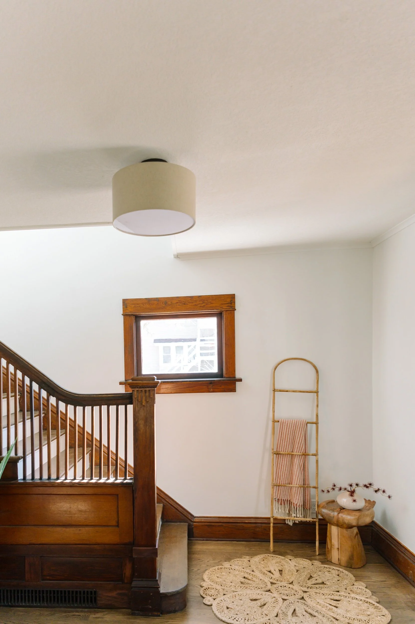 We staged the landing area with warm and pink tones to make this space feel as welcoming as possible since this is the first thing you see when you come in. We wanted this cozy little nook to set the tone for the rest of the house.