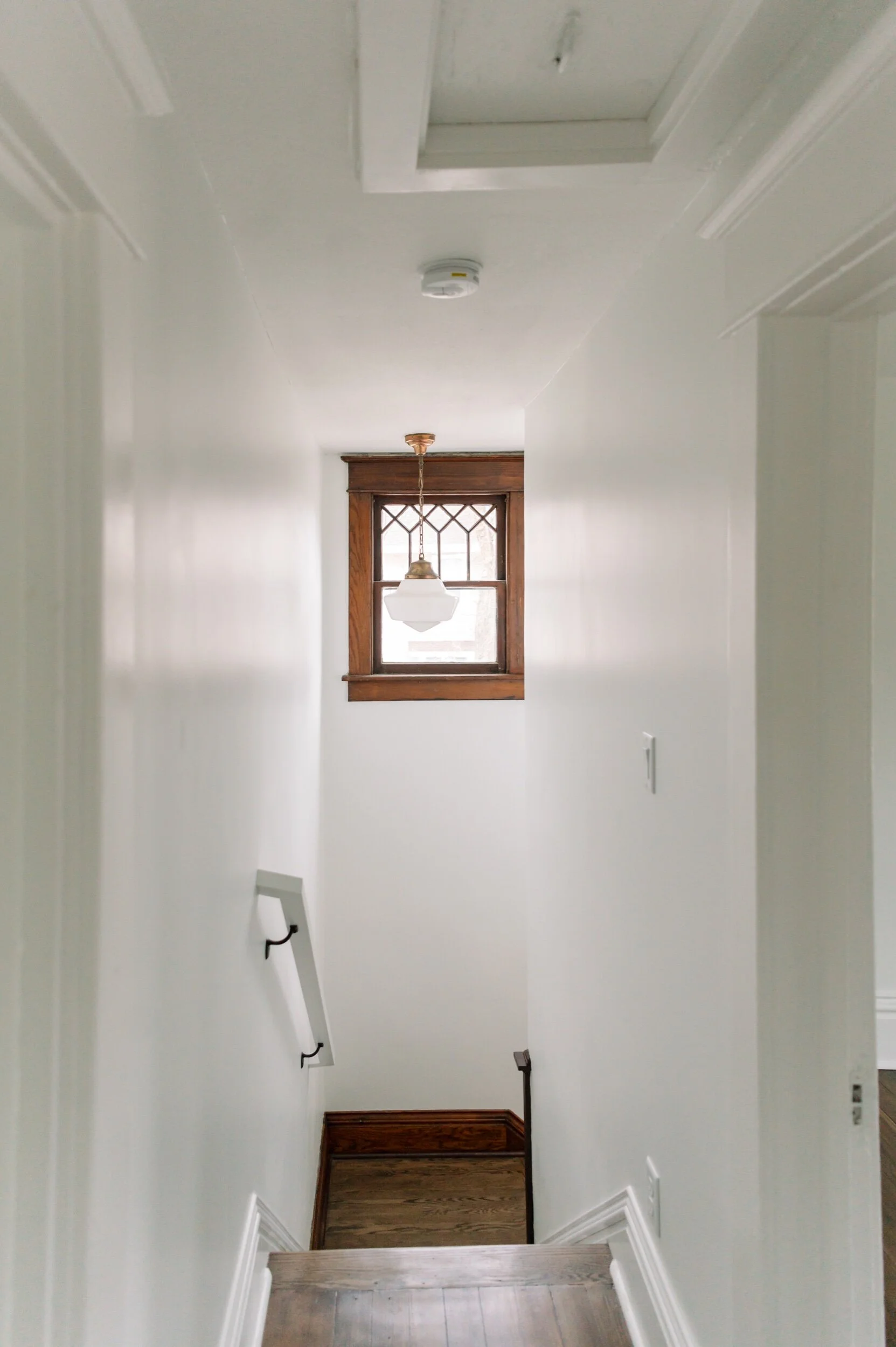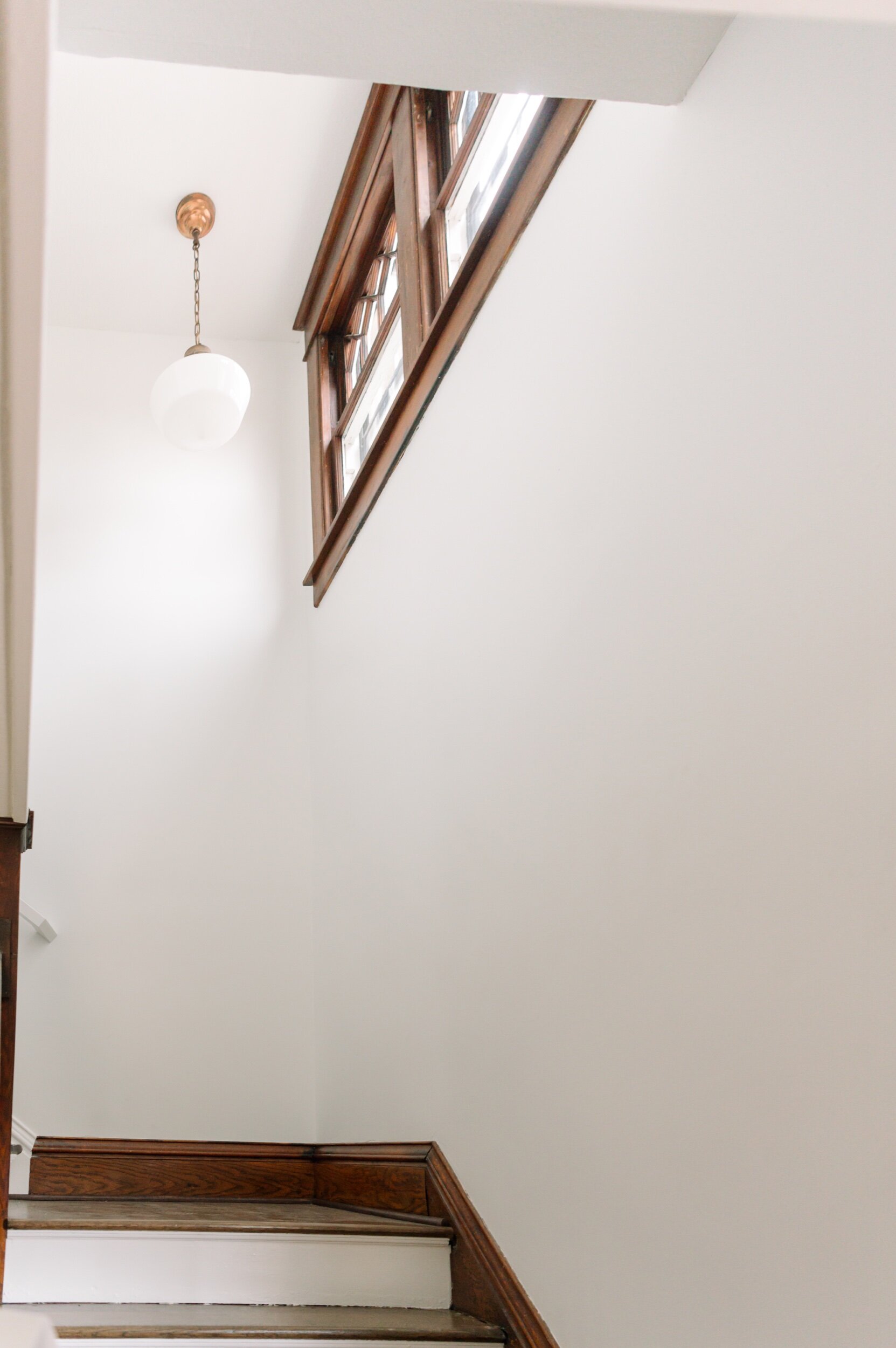 As you go upstairs, you are welcomed by beautiful brass round light fixture and ornate casement windows right next to the light fixture that illuminates the stairway.
