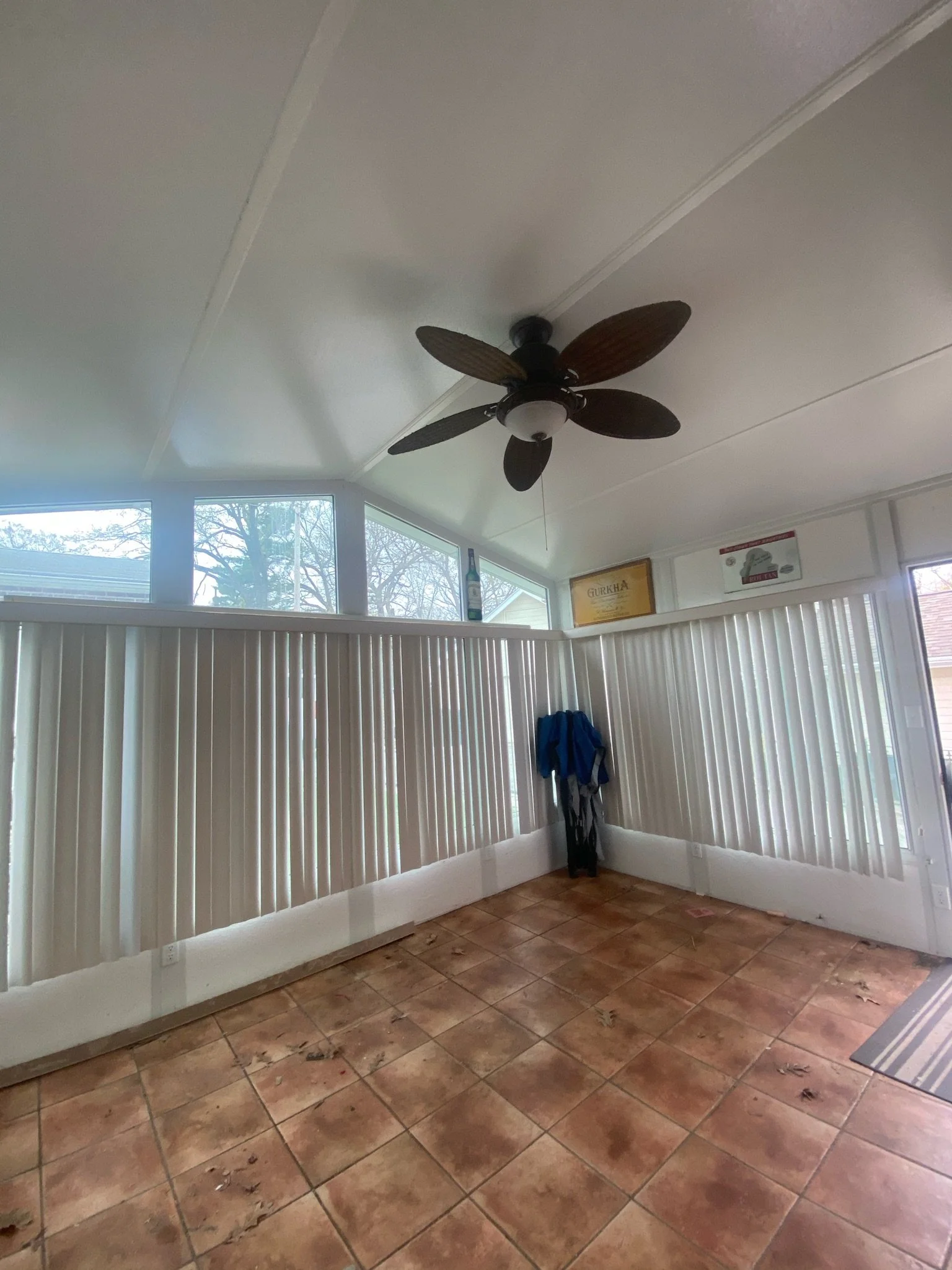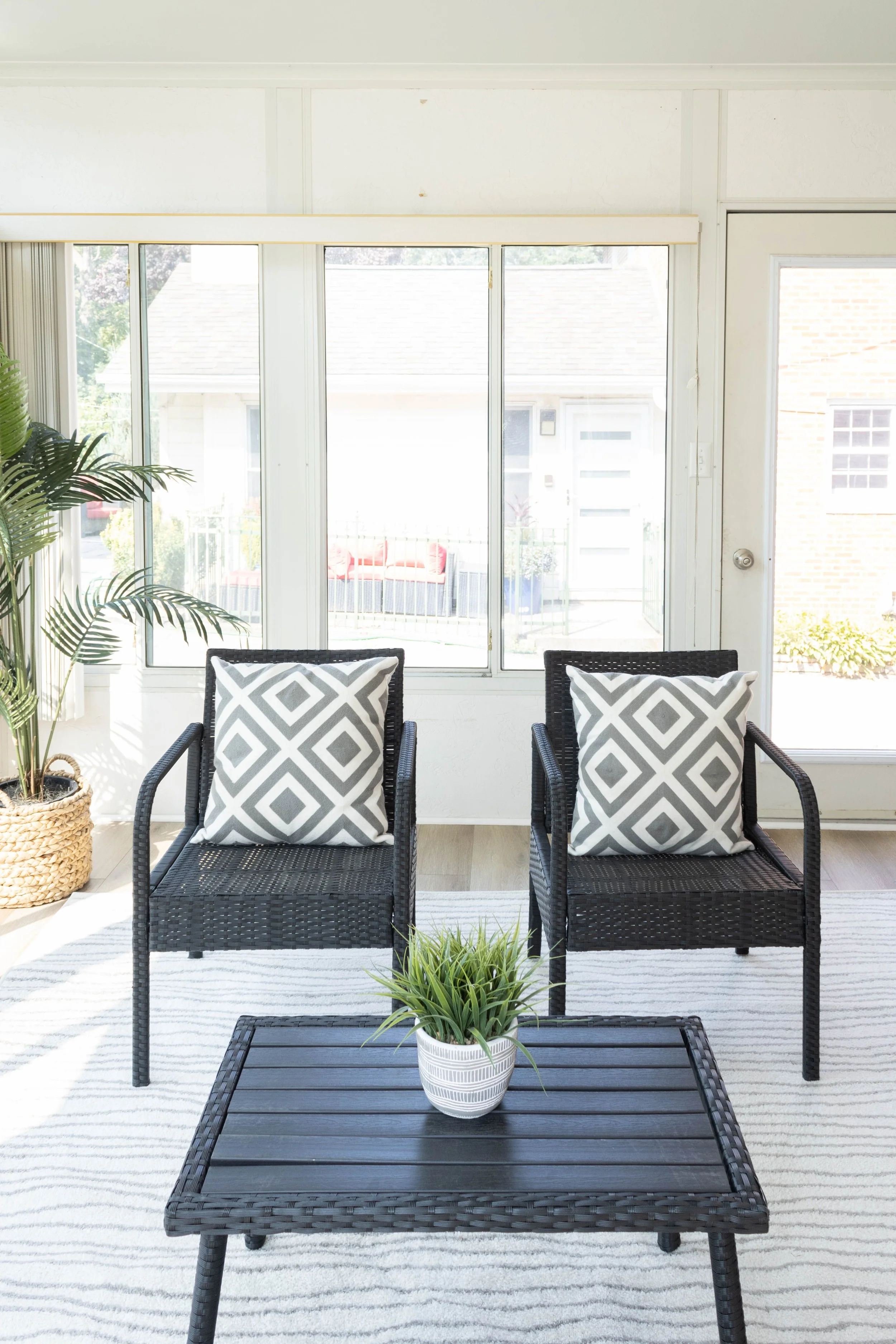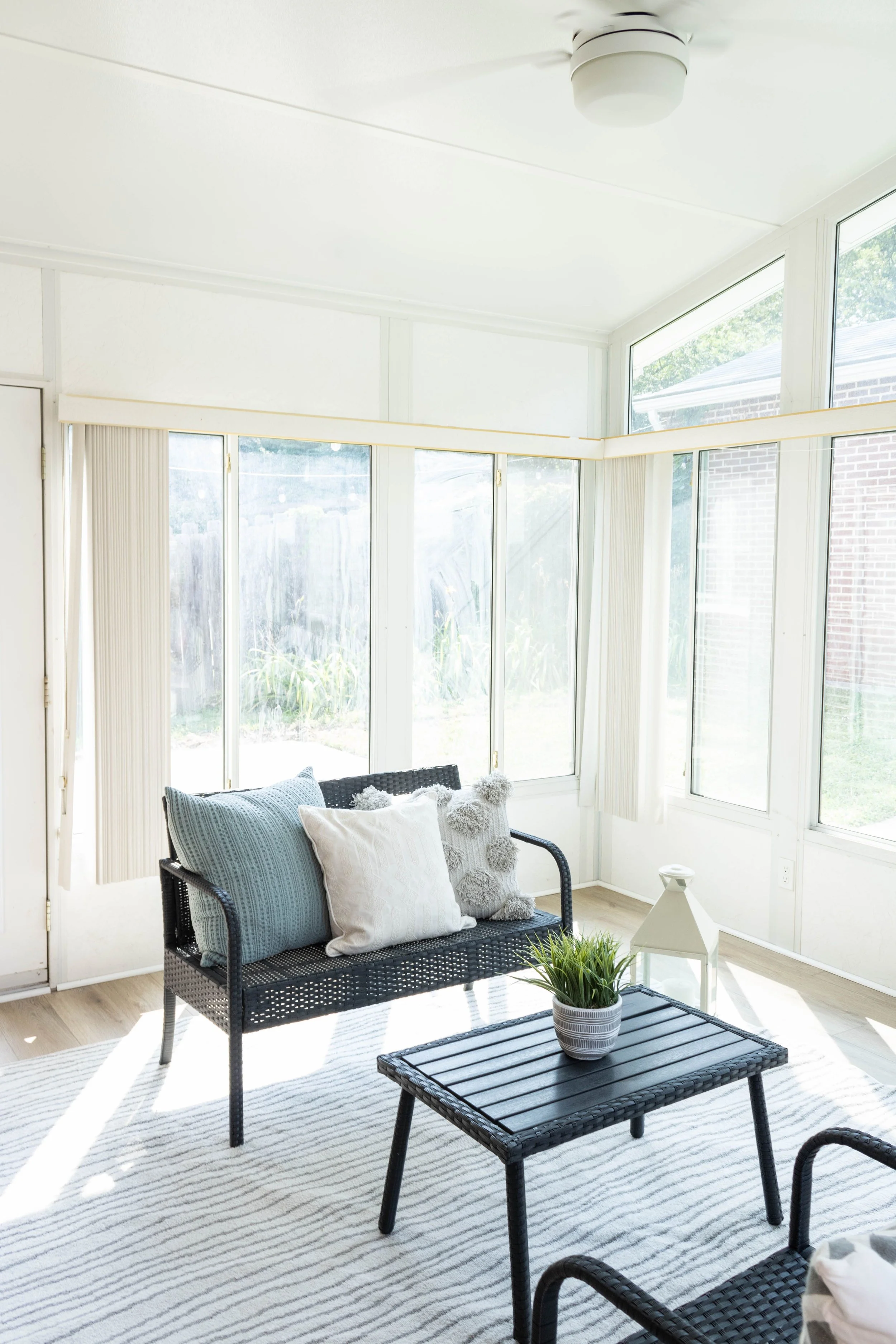 Simple updates such as flooring, paint, and lighting created a light and airy sunroom space perfect for an afternoon oasis.