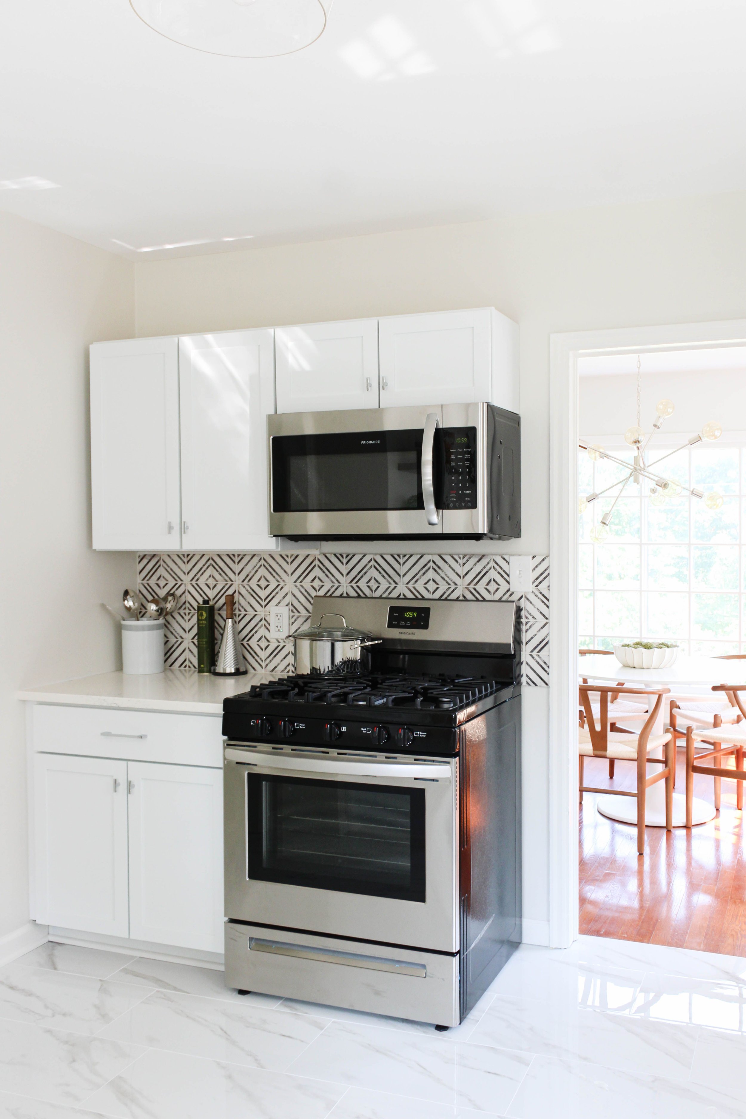 Along with new finishes, a more functional layout breathes life and possibility into a small but mighty kitchen! By moving the oven to the dining room wall and adding more cabinets, there is already a great increase in storage space.